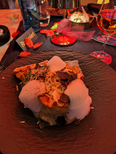 Read moreWir waren spontan gestern Abend dort. Sehr gut gefallen hat uns, dass ein Kellner uns kommen sah und die Tür aufhielt. Er schaute dann, wo ein Tisch frei wäre und er uns platzieren könne. Anmerkung: es waren mehr Tische frei als belegt, aber gut. Er wollte uns dann zum Tisch bringen, würde von einer Kollegin etwas schroff zur Seite gekickt "ich übernehme das" - so was macht man im Service nicht. Zumal diese Kellnerin uns nicht weiter bediente; nicht tragisch, da uns die Art und Weise der Dame insgesamt sehr unangenehm aufgestoßen war. Der Laden an sich ist geschmackvoll eingerichtet: ein bisschen Industrial, Tische sehr groß, Clubsessel...gut, das Gegenüber sitzt tatsächlich weit weg. Tische sehr schön eingedeckt: Gläser, Brotteller,Tischläufer, Serviette standen perfekt, sehr gut gefallen hat uns, dass alle Teile mit dem Restaurantnamen versehen war. Das macht schon was her. Wir hatten dann einen freundlichen Kellner, der uns betreute. Getränke wurden zügig aufgenommen, wobei wir zwei verschiedene Speisekarten hatten. Getränke waren zbsp. nicht identisch - das darf nicht passieren. Mit den Getränken bekamen wir Brot und Dip. Die Hauptspeise kam in zeitlich angemessenen Rahmen. Wir hatten uns für Nudeln mit Kräutersaitling und Rinderfilet Streifen sowie das Zanderfilet mit Kartoffelpüree und Babyspinat entschieden. Die Nudeln war sehr lecker, toll abgeschmeckt, das Rind perfekt gebraten und eine gute Portion. Das Zanderfilet war gut, das Püree OK, der Spinat super lecker - aber: für 25 Euro erwarten wir etwas mehr an Fisch. Die Portion war eher überschaubar (zwei kleine Filetstücke) und zur Sättigung definitiv zu klein, insbesondere bei dem Preis. Als Dessert gab es Pflaumen crumble mit Vanilleeis, was sehr lecker war. Der Service war immer präsent und aufmerksam. Alles in allem war es gut und lecker. Bei dem Preisniveau gibt es aber noch reichlich...