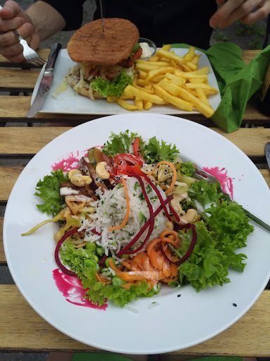 Read moreInnovatives veganes Restaurant im gemütlichen Hinterhof im Stadtkern. Das Essen war okay, aber nicht außergewöhnlich lecker und da es sich im gehobeneren Preissegment (18-20 Euro pro Hauptspeise) befindet, würde ich das dann erwarten. Ein bisschen konkreter heißt das: die Speisen haben zum Teil sehr leckere Bestandteile gehabt, aber zum Teil auch nicht und sind noch nicht komplett abgestimmt. Bei der Asia-Bowl passen die eingelegten Möhren mit dem Kokosreis z.B. sehr gut zueinander, die Pilze harmonierten von ihrer Würzung und Geschmack aber nicht mit dem Reis. Der Burger war in Ordnung, der hinzubestellte selbstgemachte Ketchup hervorragend. Ein alkoholfreies Getränk mit Erdbeeren war in Ordnung, aber sehr klein für den Preis von knapp 8 Euro. Beim Service hätte ich mir gewünscht, dass die Speise nicht einfach nur auf den Tisch gestellt wird, sondern kurz erläutert wird, um was es sich handelt. Bei der Asia-Bowl ist es z.B. nicht klar, ob die Flüssigkeit im kleinen Schälchen als Dipp für das Soja herhalten soll oder als Dressing für den Salat, oder beim Burger waren so unbekannte knusprige Scheiben aufrecht unter der oberen Brothälfte verankert und man wusste nicht was es ist und warum es auf diese Weise arrangiert war, denn essen konnte man das so nicht. Positiv außerdem, dass es ein paar Parkplätze vor Ort gibt, was in diesem Stadtgebiet keine...