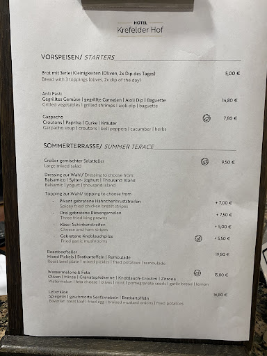 Had dinner here several times over the last 3 years and the food and service was much better. This trip my first night I had the salad with salmon for an extra 9€! I think the forgot 1/2 the salmon but for a total of €18.50 it wasn’t too bad over all. The ice cream I had for dessert had good flavor but was a train wreck. More of a sorbet than an ice cream but not a sorbet either,, something in the middle, not creamy at all and lots of ice crystals. Unfortunately the only way I could pay was when I decided to just get up and go directly to the little work station inside, in the past they have been good about asking if we were done or wanted to pay. Second night went for the Leberkäse Spiegelei | geschmorte Senfzwiebeln | Bratkartoffeln Baverian meat loaf | fried egg | braised mustard onions | fried potatoes but they were sold out at 8pm, an hour after dinner starts and there were only 4 people there. This was the only reason I did not go to one of the places down the street. I ended up ordering the Garnelen- Risotto Safransud | Orangen | gegrillte Tomaten Prawn risotto | saffron broth | oranges | grilled tomatoes instead. I was suspicious when it came out in 12 minutes and rightly so. The prawns were over cooked and rubbery, the rice was under cooked and not creamy at all, practically just normally cooked rice which I suspected when it was served perfectly formed in a cylinder. There were no oranges, I think they forgot the saffron. The flavor was good but the execution was a 1, presentation saved it from a 0. Will only eat here again as a last resort.