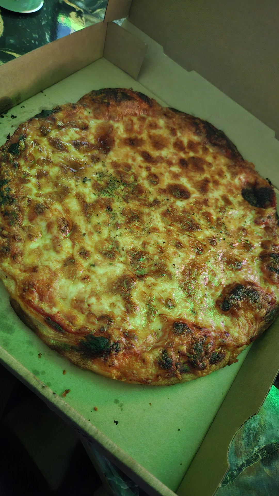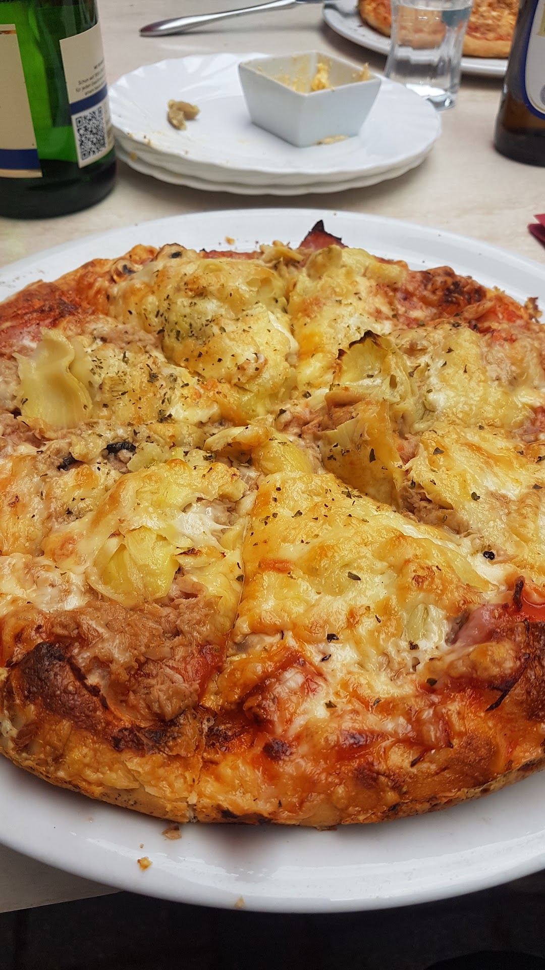 Zur Pizza: Die Margherita war unterdurchschnittlich. Wie so oft nicht original mit Mozarella, wie man es aus einer italienischen Lokalität erwarten würde. Die unregelmäßige Hitzeverteilung ist anbei den eingesetzten Blechen geschuldet, drum war der Teig nicht gleichmäßig durch. Am Oregano wurde auch gespart. Kurzum, es war noch essbar.