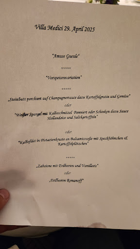 Read moreMeine Hochzeit gefeiert am 14.12.18. Planung mit dem Kellner ca. 6 Monate zuvor gemacht. Ablaufplan wurde erstellt, doch leider nicht umgesetzt. Absprachen, wie das wir bis Ende offen (was für eine Hochzeitsgesellschaft selbstverständlich ist) besprochen haben, wurden AM TAG der Hochzeit einfach über den Tisch geworfen und man sagte uns gegen 14 Uhr am Tisch ,, um 17 Uhr ist hier spätestens vorbei“ . Das die Feier um 17 Uhr enden sollte, haben wir auch nur erfahren, weil ich (die Braut) nach einer Raumerweiterung gefragt hatte zum Tanzen. Wir waren zuvor zwischendurch immer wieder im Villa Medici um weitere Details zu besprechen und immer wieder wurde betont, das es überhaupt kein Ding sei, bis Ende offen zu feiern. Es war ja für eine Hochzeit reserviert! Absprachen, wie bitte nur Wein zum Hauptgang, wurde auch einfach ignoriert und übergangen. Man hat das Personal mit den Flaschen quasi non stop in den Raum geschickt um die noch halb vollen Gläser, randvoll zu füllen. (So kann man auch Geld verdienen) Menükarten berechnet, die mit Schreibfehlern versehen waren, was einfach nur peinlich war. Da hat man als nächstes die Null Bock Einstellung uns gegenüber nochmals bemerkt. Musik lief auch nicht, da das Personal nichts an Equipment vorbereitet hatte, obwohl wir dies auch zuvor besprochen haben. Sehr schade. Als dann die Torte kam und wir die Torte angeschnitten haben, wurde von allen Seiten viel Druck gemacht, weil ja ab 18 Uhr die neuen Gäste kommen sollten und unser Raum noch gestellt werden musste. Unverschämt! Der Chef wusste angeblich nichts von der Planung. Was soll er auch anderes sagen. Ca. eine Woche später sind wir wieder zum Hotel um die Rechnung zu begleichen, die wir selbstverständlich nicht komplett bezahlt hätten, da ja Dinge ohne Rücksprache gebucht wurden. Auf jeden Fall hat der Besitzer schon auf uns gewartet und sich für alles entschuldigt und er hätte von nichts gewusst, wie es gelaufen ist blablabla. (Man guckt ja als Chef nicht eigenständig ins Reservierungsbuch und erkundigt sich über die nächsten Wochen und gerade Hochzeiten, was geplant und gebucht ist). Das Ende vom Lied ... der Chef hat lächerliche 150€ von der Rechnung genommen und noch groß erzählt, dass die nächsten Gäste nach uns, in 30 Minuten viel mehr Umsatz gemacht haben. Wir haben ja auch sofort gestoppt, nachdem wir erfahren haben, wir sind nach 2 std. schon bei 1800€ und wir um 17 Uhr gehen müssen. Haben das Geld dann lieber woanders investiert! Was uns den Abend gerettet hat!
