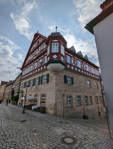 Der S'Antla Brauereigasthof (auf der Fassade steht einfach "Antlabräu") in der Altstadt von Kronach ist ein gediegenes, im Innern und im Biergarten modern gestyltes Restaurant, das Biere aus eigener Herstellung vom Fass anbietet, die in der separaten Bierkarte detailliert beschrieben sind. Außerdem kann man die Biere vor Ort in Flaschen kaufen und mitnehmen. Zwar sind die Bierstile typisch für Bayern (Helles, Märzen, Maibock, Hefeweizen), die Rezepturen orientieren sich aber an der modernen internationalen (Craft-)Bierkultur, z.B. durch Kalthopfung und Verzicht auf Fermentierung, wodurch die Biere trüb sind). Zwei Biere habe ich vom Fass probiert, das untergärige, dunkle(!) Lagerbier "Zoßler" und die "Hopfenkönigin", die trotz Kalthopfung nach der Gärung immer noch wie ein Märzen schmeckt, nicht wie ein IPA. Beide waren ausgezeichnet.