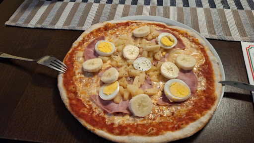 Das Restaurant liegt direkt an der Hauptstraße. Auch urig eingerichtete Lokale, wie dieses können durchaus gemütlich sein. Die Karte ist umfangreich und bietet für jeden Geschmack etwas. Wir hatten als Amus gueule (Gaumenfreude) Bruschetta = frisch gebackenes Brot mit reichlich Tomatenwürfeln aus frischen Tomaten lecker mariniert. Die servierte Portion reichte gut für 2 Personen. Insalsta mista =.gemischter Salat, mit Frischeprodukte, die saisonal der Wochenmarkt so hergibt und nicht nur 08/15. Balsamico Essig und Öl sowie Pfeffer/Salz aus der Mühle werden hier extra gereicht, so kann jeder seinen Salat selber anmachen. Dazu gehören, ebenfalls selbst gebackene Brotstückchen im Brotkorb gereicht. Die Pizzen werden aus dünnem, ober lecker-knusprigen Teig, mit den unterschiedlichsten Belägen angeboten. Der Teig, wie gesagt, dünn und knusprig, die Beläge reichlich und herrlich saftig. Später rundete ein Eis den Abend ab. Wir wurden aufmerksam, unaufdringlich umsorgt, obwohl die Terrasse unter den Sonnenschirmen, im Eingangsbereich brummte, denn wir hatten es vorgezogen, wegen derTemperaturen die kühleren Innenräume aufzusuchen, in denen wir zunächst lange Zeit alleine waren. Getränkesonderwünsche wurden korrekt ausgeführt. Ich weiß, ich war nicht das letzte Mal hier. Hier kann man mit Kindern unbedenklich einkehren. 🅿️ sind direkt vorm Haus/Eingang. Das gesamte Lokal ist barrierefrei. Auch wenn das WC mit dem großen Vorraum und den großzügigen Kabinen, für ♿ doch etwas problematisch sein könnten, wenn nicht eine kleine Restgehstrecke möglich ist. Wohlgemerkt, diese Aussage gilt nur für das Damen-WC. Auch hier ist alles einfach und funktional ausgestattet. Wie im Lokal setzt sich hier der absolut saubere Charme, der auf's wesentliche reduzierten Einrichtung fort. Alles was zu einem gemütlichen Abend in einfacher, Studententenkneipe, nötig ist, wird geboten: Essen = schmackhaft -- reichliche Auswahl -- gute Portionen--Preise moderat absolut frische Produkte --köstlich ✔ Personal = aufmerksam, unaufdringlich, sehr freundlich ✔ Ambiente= rustikal-- funktional-- überall sauber✔ Bei hohen Temperaturen drinnen kühl ✔ Sommerterasse mit ausreichendem Sonnenschutz durch Sonnenschirme ✔ 🅿️ Vorm Haus ✔ Barrierefrei ✔ Familientauglich...