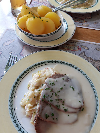 Read moreSchlechter Service, nicht zu empfehlen. Wir haben dort heute zu Mittag gegessen. Die Mittagskarte hat täglich 2 Gerichte, die man nur als Menü, mit Suppe und Kaffee bekommen kann. Da ich die heutige Suppe nicht vertrage, musste ich sie weglassen. Es gab keine Alternative. Wir haben 2 Portionen Königsberger Klopse bestellt. Es kamen 4 sehr grosse,völlig gleichförmige Klopse, 4 halbe Kartoffeln und eine mini Schälchen mit rote Beete Würfeln. Die sehr spartanische Menge der Beilagen hat uns verwundert. Wir dachten, die Mittagskarte hat hier vielleicht so kleine Portionen. Ein Gast am Nachbartisch hatte allerdings das gleiche Gericht mit der gleichen Beilagenportion für sich allein. Ich habe nachgefragt, warum wir zu zweit eine Einzelportion Beilagen bekommen haben. Die blonde schmale Bedienung hat mir patzig geantwortet: Wir hätten halt fragen müssen, wenn wir mehr haben wollen. Wir waren fassungslos. Üblicherweise bekommt man in einem Restaurant die volle vorgesehene Portion, für die man ja auch den vollen Preis bezahlt. Das ist hier offensichtlich nicht passiert. Vielleicht wurde es auch einfach vergessen. Dem Gast dann aber die Schuld in die Schuhe zu schieben ist keine Art und sehr unprofessionell. Die Klopse haben von der Fleischmasse und dem Geschmack her sehr an Fertigprodukte erinnert. Sie waren innen eine komplett homogene Masse, die nach Tiefkühlware aussah. Das war zumindest unser Eindruck. Wir waren sehr enttäuscht und können dieses Gasthaus nicht weiterempfehlen. Schade, denn das Ambiente ist schön. Patziges Personal möchte aber niemand ertragen müssen und den vollen Preis bezahlen zu müssen, wenn man keine ganze Portion bekommt finden wir...