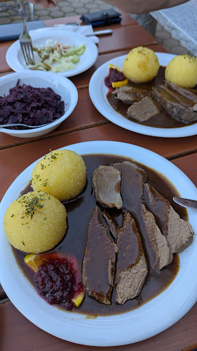 Auch der günstigste Preis kann den hier an den Tag gelegten respektlosen Umgang mit Lebensmitteln nicht rechtfertigen! Lieblos angerichtete Teller offenbaren den sinnlosen Tod der verarbeiteten Tiere, deren Fleisch im Herd dieser Wirtschaft mindestens fünf weitere Tode stirbt - bevor es vertrocknet mit einer Pfütze Convenience-Soße und einem gummiartigen Kloß traurig auf dem Teller landet. Das gereichte Blaukraut entstammt direkt dem günstigen Discounter-Glas. Der Salat ist eine Zusammensetzung aus Dosenmöhren, Dosenbohnen, u.ä., die allesamt in Zuckerwasser ertränkt wurden. Das TK-Eis gesellt sich als Nachtisch zu TK-Himbeeren und Sprühsahne. Ein Espresso wird hier als Filterkaffee in Espressotassen serviert. Die Bereitschaft der Wirtschaft, den gesamten Tisch mit Beilagen in rauhen Mengen zuzupferchen lässt die geringe Qualität (und den geringen Einkaufspreis) der Lebensmittel erahnen. So hatten wir schließlich für 12 Personen ca. 3 kg Blaukraut, 6 volle Saucieren und etliche Extra-Klöße zwischen unseren Tellern stehen. Angesichts einer solchen Masse an sinnlos auf Teller geladenen Lebensmitteln geht auch das letzte bisschen...