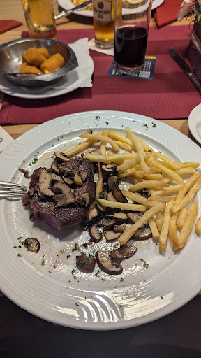 Read moreEine typische Speisegaststätte, welche durchaus empfehlenswert ist, was Speisen wie Getränke und die Preise angeht, wenn man bei der Einrichtung nicht unbedingt auf einen gehobeneren Standart Wert legt. Die Bestellungen werden zügig vom Personal bearbeitet. 👍👍👍 Dass angegliederte, sogenannte 'Hotel', ist seiner Bezeichnung nicht würdig. Im hölzernen Treppenhaus finden sich zahlreiche abgestellte Dinge wie Leergut, Töpfe, Kartons, Kleidung und zig Paar Schuhe, Latschen und Pantoffeln, völlig unordentlich und überall im Weg stehend, auf den Stufen wie dem Podest verteilt. Auf dem 2. OG befinden sich die Kammern. Lichtschalter sind schwer bis nicht zu finden. Im muffigen Flur steht für Raucher ein höchst verschlissenes und schmutziges Kunstledersofa bereit, ein kleiner Beistelltisch mit überlaufendem Ascher wie eine alte Stehlampe runden ab. Da diese Raucherzone auch nachts frequentiert, wie mit den Stimmen von laut geführten Telefonaten und Unterhaltungen beschallt wird, ist man von Ruhe hinter der kaum mehr als aus Pappe bestehenden Zimmertür, weit entfernt. Zigarettenqualm zieht durch die nicht dicht schließende Tür in dass "Zimmer", in dem von Ausstattung keine Rede sein kann. Auch mit nur geringen Ansprüchen, kann die Unterkunft bei einem Preis von über 65,-€, nur als "nicht empfehlenswert" klassifiziert...
