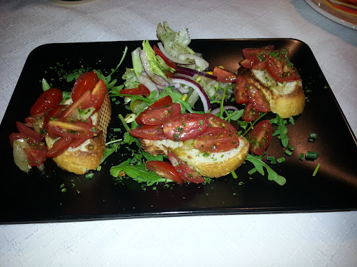 -Die Zubereitung eines klassischen Bruschettas beinhaltet ein mit Knoblauch eingeriebenes Ciabatta, was mit einer Tomaten-Zwiebel Zubereitung belegt wird. Hier wurden geviertelte Cherry-Tomaten auf eine geölte Scheibe Ciabatta gelegt. Wundert aber niemanden, wenn die Serviekraft den Namen des Gerichts nichtmal korrekt aussprechen kann [Brusketta].