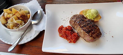Not a typical German restaurant where you wonder who can eat the size of meat that is getting served. Here the portions are more of the time we live in and thinking about the future and trying to reduce the amount of meat we consume. Probably the first time I manage to eat my full steak and it was perfectly done. And still more than enough. The small bread with very nice herb butter was one of the better once I ever had. The Chorizo twist on the steak.. a saus ? beside the steak I could not figure out. But not spicy and no Chorizo.. this looked more something from a local supermarket. Desert was not complete. If you not like chocolate you have not a lot options if you want to have some ice. Crepes you you easily can have with some alternatives fruits. Or a simple cheese plate. Something you really would suspect in this place. Wine / price perfect in balance. Service great. It always help when people speak and understand some English. Overall a must do when you are...