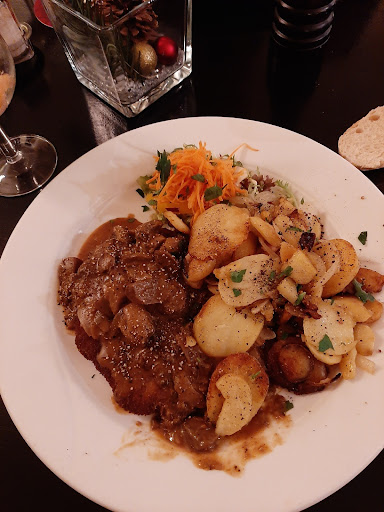 Holsteiner Schnitzel: Wahrscheinlich aus der Fritteuse, geschmacklich okay, aber das Spiegelei darauf war ein Reinfall – trocken, dunkel und vermutlich viel zu lange in der Pfanne.