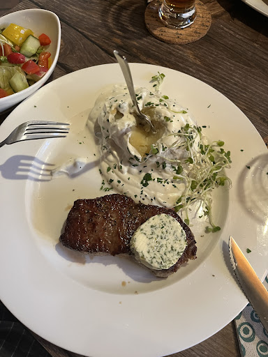 Von meinen drei Steaks war lediglich das Rind einigermassen ordentlich zubereitet. Pute und Schwein waren totgebraten und trocken. Die Ofenkartoffel kam mit — hallo, da war sie wieder! — der bekannten Tsatzikicreme. Eine für alles.