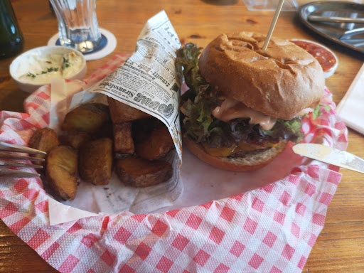 Read moreGegessen habe ich einen Burger der soweit in Ordnung war. Wäre allerdings toll gewesen wenn der Salat auch gewaschen werden würde, dieser war sandig extrem sandig. Im weiteren Verlauf Getränke zu bestellen erwies sich als schwierig, da man sehr lange auf seine Getränke gewartet hat. Was alles noch verzeihbar ist, der Laden war voll. Die Bedienung die wir hatten war allerdings sichtlich überfordert. Ob es um Bestellungen ging, oder ums abräumen. Die Luft im Restaurant war zum Abend hin unerträglich, die Türen wurden geschlossen wohl aufgrund von Anwohnerbeschwerden. Warum die Lüftung/ Klimaanlage nicht eingeschaltet wird, ist mir nicht verständlich. Wahrscheinlich damit die Gäste mehr trinken, oder dem Wirt der Strom zu teuer ist. Beim Verlassen des Gebäudes wurden wir etwas rüpelhaft von dem aufgeblasenen Security um Stille gebeten. Wir Sprachen/ verabschieden uns gerade von der Familie. Ganz ruhig/ normal auf dem Parkplatz. Was aber Ihm zu laut war, die Uhr war 22.35 auf einem Freitag, oberarrogant war sein verhalten. Ich bin über 50 Lenzen und so ein Hong will mich erziehen/ belehren (Lehre erstmal den richtigen umgang mit Menschen) Was zu Folge hat, dass wir diesen Laden erstmal nicht wieder besuchen werden. Aber sonst war es nicht schlecht, an dem Abend war Karaoke angesagt. Ergo, wer nichts wird, wird Türsteher. Man merkt es, bin/ war echt angep... von dem Nerd , sorry...
