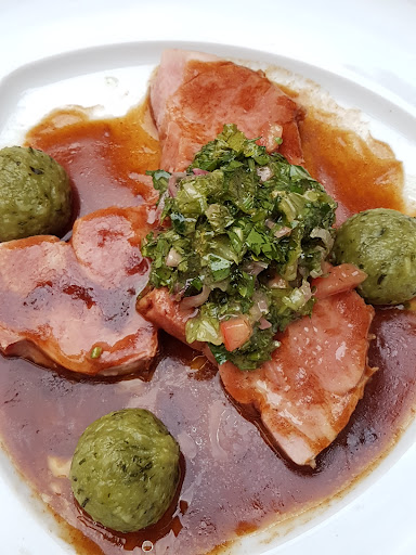 The "7 Kräuter - 7 Türme" (seven spices, seven towers) is an excellent cured pork dish with potato dumplings. The dumplings were just potato on our first visit, while green due to a lot of parsley on a subsequent visit. The meat cuts also differed slightly in thickness, but both thin, and thick cuts were equally delicious!