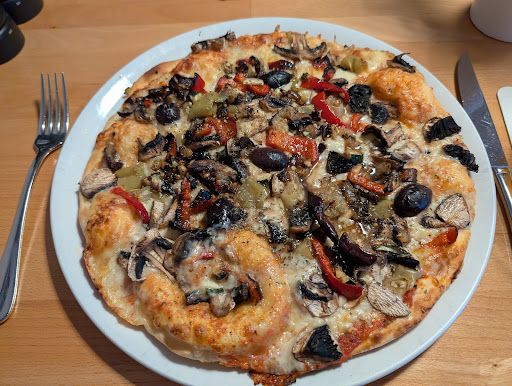 Die Speisekarte (Salate, Pasta, Pizza, Fleisch...) besteht aus einem laminierten Blatt Papier, beidseitig bedruckt. Ich entscheide mich für ein alkoholfreies Pils und eine vegetarische Pizza. Vom Tresen wird durch den Raum gerufen, alkoholfreies Pils wäre nicht mehr da, nur Weizenbier. Gut, dann eben Weizen. Das Bier (0,5 l zu 5,80 €) wird zügig serviert, die Pizza zu 14,50 € nach angemessener Wartezeit. Dunkel sieht die Pizza aus. Das liegt an den schwarzen Oliven, den fast ausnahmslos schwarzen Champignons und den ebenso dunklen Zwiebelstücken. Geschmacklich okay, aber fürs Auge nicht so meins.