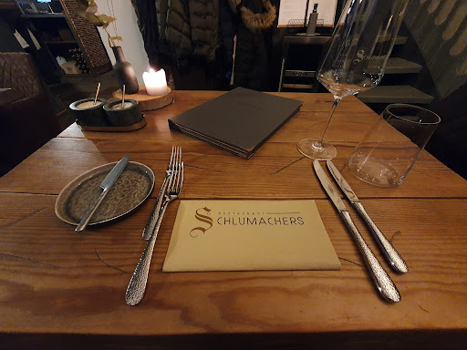Meine Partnerin und ich gehen seit Jahren in das Schlumachers. Wegen des höheren Preises ist es immer ein besonderer Besuch, der einen bestimmten Grund braucht - das ist vielleicht drei Mal im Jahr der Fall. Wie entscheiden uns immer für das Überraschungsmenü mit 4 Gängen, hier stimmt die Menge und alles andere passt aus unserer Sicht dann preislich nicht mehr. Jeder Besuch endet bei so ungefähr 200 Euro für uns beide, ABER: Nicht jedes Mal zahlen wir diesen Preis mit einem guten Gefühl und einem Lächeln im Gesicht. An einigen Tagen verlassen das Restaurant unfassbar beseelt und schweben zurück Richtung Parkplatz. Noch den ganzen Abend schwärmen wir von der Aromenkombination und der tollen Atmosphäre. An anderen Abenden zahlen wir und sind traurig, weil es nie so lief wie bei den tollen Abenden. Woran liegt das? Das Essen ist jedes Mal handwerklich sehr gut gemacht. Toll präsentiert. Wir lieben die Kombinationen und die Kreativität der Küche. Jede Saison gibt es einen kreativen Cocktail oder Aperitif. Das läutet den Abend gut ein und dann entspannt man in diesem tollen Altbau-Ambiente. Leider ist der Service sehr unterschiedlich und müsste oben eigentlich insgesamt zu "nur" 4,5 Sternen führen. In dem Preissegment möchte ich nur ein Mal darum bitten, dass neues Brot gebracht wird und das nicht häufiger, weil es jedes Mal vergessen wird. Es wäre auch toll, wenn der zum Nachtisch bestellte Cappuccino zeitgleich mit dem Dessert kommt - oder man wird kurz vorher darauf hingewiesen, dass das Dessert nun unmittelbar anrückt und ob man irgendwas dazu trinken möchte. Manchmal wird man bei dem Überraschungsmenü sehr "alleine gelassen", weil einfach nur das Essen gebracht wird und man nichts dazu erklärt bekommt oder man vielleicht gefragt wird, ob man zwischendrin eine kurze Pause einlegen möchte. In der Vinothek ist es schön, aber bei geöffneter Tür wird es echt kalt, ECHT kalt. Es kann einfach nicht sein, dass das Personal die Tür aufreißt, die Tür geöffnet lässt und erst, nachdem alles an alle Gäste verteilt wurde und man am Tisch geschnackt hat, die Tür wieder geschlossen wird. Das passt doch einfach nicht zu dem Anspruch des Restaurants! Und meine letzte Bitte: wenn ich bei all den Besuchen vorher neben meinem Cappuccino ein Stück extra Keks/Kuchen liegen habe, dann gucke ich echt blöd aus der Wäsche, wenn das plötzlich fehlt. Ihr seid wirklich toll, wir kommen unfassbar gerne und haben kein Restaurant öfter besucht als das Schlumachers - aber bitte sorgt dafür, dass diese kleinen Fehler nicht so unbeständig häufig...