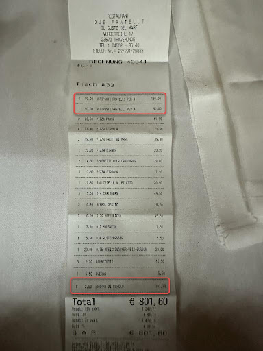 Nachtrag 05.10.2023: Es ist schon interessant, wie hier versucht wird, gegen unliebsame Bewertungen vorzugehen. Ich habe vor kurzem von Google erfahren, dass ein Beschwerdeführer (wer könnte das wohl sein?) gegen meine Bewertung vorgegangen ist, da angeblich keine Geschäftsbeziehung besteht und der angegebene Name wohl ein Fake-Name ist. In der Nachricht von Google waren noch weitere 30 Namen aufgelistet, ich war vermutlich nicht der einzige Empfänger dieser Mail. Natürlich besteht eine Geschäftsbeziehung, ich füge als Beweis die Rechnung von damals hier an (inkl. der völlig überzogenen Preise für Antipasti und Grappa).