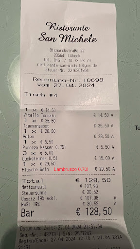 Uli Ui Ui….. was hat das Restaurant „San Michele“ mit Antonio nachgelassen - es war für mich früher immer mal was besonderes Feeling dort Essen zu gehen, weil man sich als Gast + Freund willkommen gefühlt hat …. aber leider war das einmal….. Es hat doch leider extrem gelassen. Außer extrem teuren Preisen für Getränke und teuren Preisen für die Speisen ließ die Qualität im Verhältnis zum teuren Preis doch extrem zu Wünschen übrig. Wir waren heute mal wieder - und wahrscheinlich auch zum letzten Mal - bei Antonio und seiner Frau im Restaurant „San Michele“ in Lübeck essen.
