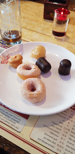 Read moreKann man nachen: wenn man mit einer grossen Gruppe Menschen spontan essen gehen oder fahren möchte. Parkplätze sind genügend vorhanden. Bei gutem Wetter ist draussen sitzen möglich. Die runden Tische sind für eine Kommunikation perfekt geeignet. Für unsere norddeutschen Verhältnisse ein riesengrosses Gebäude, dass einst anderen Zwecken diente und nun zu einem Multi-Kulti-Asia- Europian-Diner aufwendig in ziemlich chinesischem Stil umgebaut ist: üppige Raffgardinen, das unvermeidliche Aquarium am Eingang, auffallend buntes Licht an der Decke, ein umlaufender Wassergraben mit Wasserspiel, alles in enormen Ausmassen. Für Menschen mit Bewegungseinschränkungen, ältere Menschen, ist die Tournee um die Essensangebote sicherlich anstrengend. Gut, wenn eine geduldiger "Arm" dabei ist. Die 4 Selbstbedienungsbuffets haben enorme Auswahl und sind gut beschriftet. Man findet sogar eine hommage an unseren Gaumen im All-You-Can-Eat-Buffett: Bratkartoffeln und Rosenkohl und Blumenkohl - jedenfalls, als wir da waren. Die Servicekräfte sind bemüht und freundlich. So weit so gut. Preis - Leistung. Nun gut. Unser Jasmintee war im Beutel und lag wohl schon eine Weile geöffnet rum. Das Essen? Auf den ersten Blick eine Überforderung. Mit Aufmerksamkeit eher doch - na ja. Es ist sicher schwierig, bei zu geringer Nachfrage das Angebot frisch zu halten, besonders an der Frischfleisch- und Fischtheke, an der man sich seine Portionen aussuchen und direkt zubereiten lassen kann, zumal nach asiatischer Art die Lebensmittel schon stäbchengerecht zerkleinert sind. Dafür wäre es sicher möglich, die zubereiteten Speisen überhaupt und differenzierter zu würzen, die Sossen nicht bis zur Unschmeckbarkeit zu verlängern. Da hilft dann auch kein Schuss Soyasosse mehr, wenn die auch noch dünn schmeckt. Dass Alles, was kross gebraten oder fritiert aus der Küche kam, in den Wärmebehältern wieder pappig wird, sollte jedem klar sein, der sich auf Büffettessen einlässt. Ein Highlight am Nachtischtresen sind die mundgerecht zubereiteten frischen Früchte (auf der Rückseite der italienischen Fraktion: Tomate, Mozarella und Tiramisu) Die sind ein Genuss. Das Eis? Egal ob grün, rosa, braun: nur süss. Kein Geschmack. Auf die fritierten Bananen, Lychees & co haben wir verzichtet. Dieses Restaurant hat kein klar erkennbares Konzept in seinem Erscheinungsbild. Von allem etwas, von allem viel, der Versuch einer 100% Weltspeisenabdeckung. Ich wüsste nicht einmal genau zu sagen, welche Zielgruppe an Gästen angesprochen werden soll, ausser Menschen mit unersättlichem Appetit und groben Geschmacksnerven. So schade! Ein Trösterli: der Glückskeks, den man nach dem Bezahlvorgang erhält. Fazit: Anschauen-sicherlich, Essen, wie ich anfangs sagte, kann man...