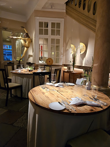 Read moreBei der Ankunft waren wir überrascht, wieviele Tische und Sitzplätze in dem an sich sehr schönen Restaurant aufgestellt worden waren. Da sollte offensichtlich jeder verfügbare Platz genutzt werden, was zu einer beengten Atmosphäre führte. Um an meinen Platz zu gelangen, musste ich über zwei Treppenstufen in eine Ecke steigen, was später dazu führte, dass auch die Bedienung nicht wirklich Platz für ihre Arbeit hatte und immer vor meinem Gesicht hantieren musste. Die nächste Überraschung war, dass auf dem Tisch bereits Brot und Butter bereit standen. Wir konnten nicht einordnen, ob wir direkt damit starten sollten und bekamen dazu auch keinerlei Info. Schließlich fingen wir an zu essen, die Butter war dann leider schon ziemlich weich. Ob es irgendeine besondere Butter war, können wir nicht sagen, da wir, wie den gesamten weiteren Abend, überhaupt keine detaillierteren Informationen zu unseren Gerichten erhielten. Unser Nebentisch erhielt die ein oder andere Info, wir leider nichts. Nachfragen war kaum möglich, da alles zackig und wenig zugewandt serviert wurde. Auch zu den Weinen aus der Weinbegleitung gab es außer der Bezeichnung des Weines keine weiteren Ausführungen. Das war wirklich sehr schade, denn sowohl das Essen als auch die Weine waren hervorragend. Durch das Drumherum wurde das ziemlich herabgesetzt. Bevor jetzt jemand sagt, dass wir wohl keine Ahnung haben, möchte ich noch hinzufügen, dass wir schon einige Sterne-Restaurants in Deutschland und auch im Ausland besucht und daher durchaus Vergleiche haben. Das hier war zwar relativ günstig, aber eben auch kein Highlight, wie man es bei dem Besuch eines Sterne-Restaurants erwartet und...