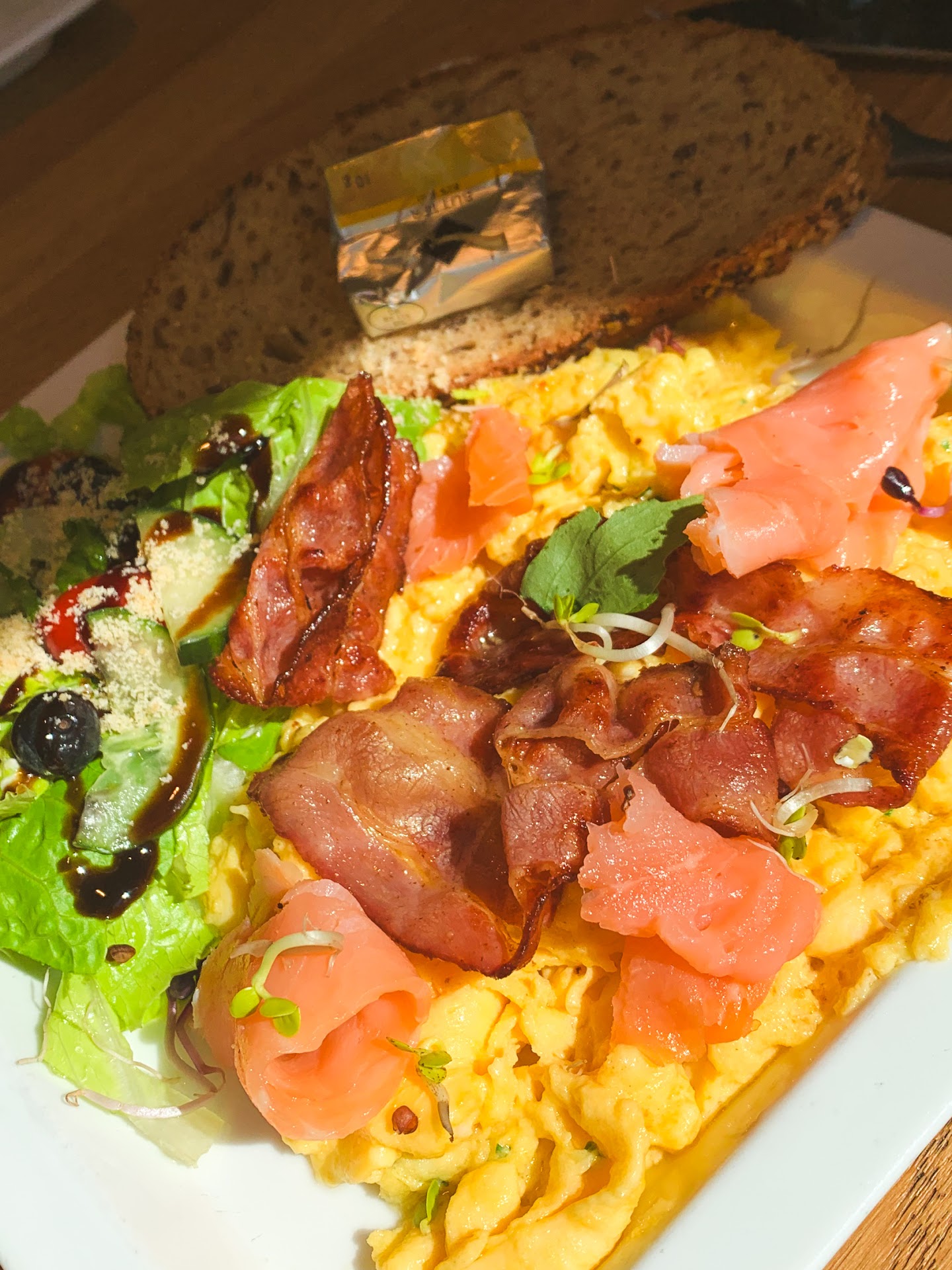 Aber: Am meisten gestört hat mich die Karte. Es gibt ein Frühstück für 2 Personen, ein herzhaftes und ein süßes. Ich mag Nutella, Salami und Schinken. Es musste erst einmal nachgefragt werden ob man das tauschen kann. Besser wäre ein Basis Frühstück, dass man updaten kann. Hatte im Internet vorher nach der Speisekarte geschaut. Da wurde ein Salat beworben. Die Bedienung musste erstmal die Chefin fragen fragen ob Sie den Salat schon machen kann. Es gab zum Salat nur ein Dressing. Mit Käse. Ich hasse Käse. Ein Dressing mit Essig, Öl und Gewürzen hätte auch nicht lange gedauert es frisch zu machen.