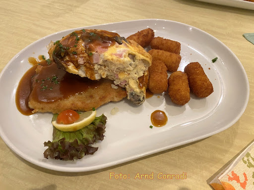 Die Speisekarte bietet eine solide Auswahl an Steaks und Schnitzelvariationen, wie z. B. Pfefferrahmschnitzel oder klassisch mit Preiselbeeren. Was uns allerdings gefehlt hat – gerade weil wir mit acht Personen da waren – war das wirklich klassische, handwerklich gemachte Schnitzel. Für mich persönlich gehört dazu ein Schnitzel, das so groß ist wie der Teller, dünn geklopft, zart und mit einer knusprigen, luftigen Panade. Das Schnitzel, das uns serviert wurde, erinnerte – bitte entschuldigen Sie die offene Wortwahl – doch eher an ein Tiefkühlprodukt. Es war keinesfalls ungenießbar, im Gegenteil: Geschmacklich war es gut, alle wurden satt und keiner war unzufrieden. Nur: Die Erwartungen waren schlicht andere.