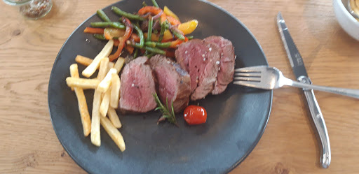 Essen: Wir haben uns für das Chateaubriand (für zwei Personen) mit Ofengemüse, Pommes und Pfeffersauce entschieden, Gargrat medium (wir wurden gefragt). Das Fleisch wurde im Ganzen an den Tisch gebracht und von der Kellnerin Sabrina fachgerecht in Scheiben geschnitten und serviert. Der Garpunkt wurde zu 100% getroffen, das Ofengemüse hatte noch Biss und war gut gewürzt. Die Sauce war lecker, hätten wir bei der Fleischqualität aber nicht gebraucht. Zu dem Fleisch gab es noch ein Steakgewürz, welches super gepasst hat.