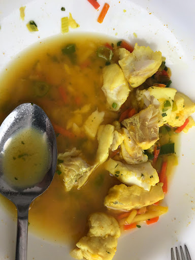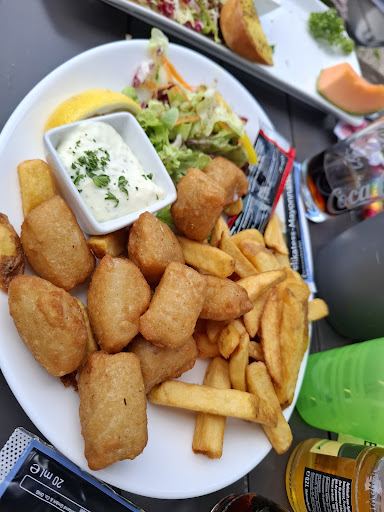 Read moreDer Backfisch war wirklich sehr sehr lecker, der Pellkartoffelsalat schmeckte wie aus dem Großhandels-Eimer aufgepeppt mit Kirsch-Tomaten, die Remoulade war okay. Dem Essen würde ich trotzdem eine 4,5 geben. Es war im Gegensatz zum Ambiente überraschend gut! Das Besteck fehlte leider - wir wollten alternativ am Strand essen - wurde aber problemlos nachgereicht. Was mir nicht gut gefiel, dass wir uns nicht an einem Tisch setzen durften, nachdem einer freigeworden war - nur knapp eine Minute nachdem wir die Bestellung abgegeben hatten. Wir hätten gern auch noch Getränke oder ein aufwendigeres Essen bestellt, aber wegen dem fehlenden Sitzplatz darauf verzichtet. Daher gibt es von mir keine 5 Sterne, ansonsten war der Service sehr nett und die Reaktion doppelt unverständlich. Hinterher haben wir uns gefragt, wohin mit dem Müll. Die Mülleimer waren Möwensicher, d.h. die Umverpackungen passten nicht hinein. Unsere Vorgänger haben ihre To-go-Verpackung also neben den Abfall gestellt und prompt hat eine Möwe die Tüte Richtung Strand gezerrt. Wir haben unseren Müll mitgenommen, um ihn zu Hause zu entsorgen, da wir auch am Restaurant keinen passenden Müllbehälter gefunden haben. Abgeben wollten wir ihn nicht, da sich gerade wieder eine Schlange vor dem schmalen Eingang...