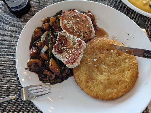 Meine Wahl fällt auf "Gegrilltes Putensteak mit Gemüse aus dem Wok, Sesamsauce und hausgemachten Kartoffelrösti zu 18,90 €."