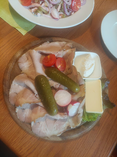 Wir hatten 1 Wurstsalat groß und einen kalten Braten. Dazu jeweils 3 Scheiben vom selbstgebackenem Brot. Schön angerichtet mit viel Herzblut zubereitet. Mein Mann und ich waren uns nicht ganz sicher, aber der Wurstsalat hatte meiner Meinung nach einen Hauch von Meerrettich im Dressing, was ihn besonders würzig machte. Die Wurst, Regensburger, war in Streifen geschnitten, mit Essiggurkenstreiferl und viel roten Zwiebeln garniert. Der kalte Braten war hauchfein aufgeschnitten und mit Essiggurke, Meerrettich und Radieserl am Brettl drapiert. Wirklich schön.
