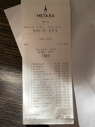 Für das Yelp-Treffen im August hatten wir uns das Metaxa in Laatzen ausgesucht. Das Restaurant hat eine Menge Tische im Außenbereich vor dem Restaurant, welche auch zum größten Teil überdacht sind. Wir sind dort an einem schwülen Mittwochabend um 18:00 aufgeschlagen und bekamen auch einen Tisch im Außenbereich. Die Getränkebestellung kam recht zügig und wurde von einem Ouzo für jeden begleitet. Was wir zu dem Zeitpunkt noch nicht wussten war, dass es für eine lange Zeit das letzte Getränk sein würde. Nachdem wir die Speisen bestellt hatten, kamen die Vorspeisen und der Beilagensalat recht zügig. Der Tsatsiki (4,6€), wie er hier heißt, war ok. Das Brot, was dazu gereicht wurde, war Standardware, wie es bei vielen Griechen serviert wird. Der Saganaki (9,1€) meiner Begleitung war nur lauwarm, vorfabriziert und wurde nur aufgewärmt. Beim Abräumen der Vorspeisen übersah der Service, dass 3 von uns leere Gläser vor sich stehen hatten. Es dauerte insgesamt 25 Minuten und 2 Besuche des Service an unserem Tisch, bis es uns gelang, eine weitere Getränkebestellung auszulösen, allerdings nicht ohne patzige Bemerkungen des Service zum Thema. Ca. 1 Stunde nach den Vorspeisen, wir waren bereits seit 1,5 Stunden im Restaurant, kamen dann auch endlich die Hauptgerichte. Der Grillteller (15,9€) meiner Begleitung war bis auf das trockene Fleisch am Spieß in Ordnung und auch von der Portionsgröße ausreichend. Vom Bifteki (16,1€) konnte man das allerdings nicht sagen. Das war das kleinste Bifteki, was ich bis jetzt in der Region Hannover serviert bekommen hatte. Die Käsefüllung war fest und stand wie eine 1 und war recht geschmacklos. Ich kann mich nicht erinnern, wann ich jemals von einem Bifteki in einem griechischen Restaurant so enttäuscht gewesen bin.
