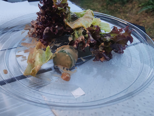 Am Stellplatz die Enttäuschungen. Der Salat war jenseits eines Italienischen Salates. Komplette, unzerteilte Salatblätter, dann der Strunk vom Salat, das Ende einer Gurke. Lecker. Die Salatsoße ersäufte zum Teil den Salat. Oben waren als Alibi ein paar gehobelte Parmesanstreifen. Der Boden des Salatbehälter war mit billigen Reibekäse ausgelegt. Meines Kenntnisstandes gehören Ei, Parmesanstreifen, Schinken und Oliven nach oben als Garnitur. Das Ei hatte zudem einen grauen Rand. Normal sind wir keine Meckerer, aber der Appetit auf frischen, knackigen Salat ist uns vergangen.