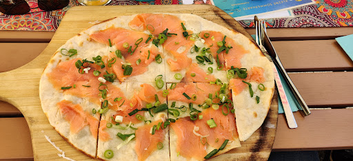 Ok..great outside terraces, very well decorated. But this is where the problem starts. 3 of us wanted 2 coffees and 1 beer. We asked if they would come to the table? Yes. Then immediately requested to come inside as it is self service.. 20 or so mins later a waiter told us we couldn't sit at that table?!? Food etc is served behind a roped off terrace on the left without any sign? Something to do with 2 businesses in 1 and only one permission certificate from the city of Lahnstein. I won't visit again as I felt it confusing although the guy was polite. The waitresses definitely appeared to have only been working for one day. Location very good and as I said decor plus music programm good. Price for our drinks, nothing fancy...