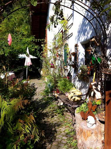 Die Natur hat für jeden ein stilles Örtchen parat, einen Platz, der sich danach sehnt besucht zu werden. So gibt's inmitten von Stock und Stein, umgarnt von Wildkräutern, steinigen Figuren und inspirierenden deutschen Sprüchen wie "Es muss von Herzen kommen, was auf Herzen wirken soll." (Goethe) solch eine Gelegenheit, um zur Ruhe zu kommen, die Gedanken schwelgen zu lassen oder mit einem guten Freund spielerisch über das Leben zu philosophieren. Das Einzige was davon nicht übertrumpft wurde und bei mir den ersten Platz belegt hat, war der saftige, köstliche Schoko-Nuss-Gugl-Kuchen der lebensfrohen Frau König. Meine Augen konnten sich kaum satt sehen, so war das Erkunden des Ladens ein kleines Abenteuer und der Kontrast dazu der Garten, der mich dann wieder durch seine stille, beruhigende Atmosphäre wieder vereinnahm. Als Künstler war dieser Ort nicht nur inspirierend für mich, sondern er strahlte auch Geborgenheit aus. Im Schoß der Natur ist der Trost Dir genug. Bis zum...