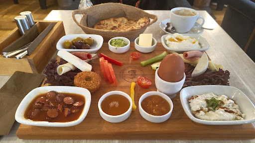 Ich entscheide mich für das "Große Frühstück ( Tomaten, Oliven, Paprika, Butter, Konfitüre, Honig, Joghurt, Avocado-Aufstrich, Auberginen-Aufstrich, Gouda, Schafskäse, 1 gekochtes Ei, Würstchen, Rindersalami, Geflügelwurst, Fladenbrot, 1 Cay)". Serviert wird das Ganze auf einem geräumigen Brett, dazu schmeckt ein hervorragender Kaffee.