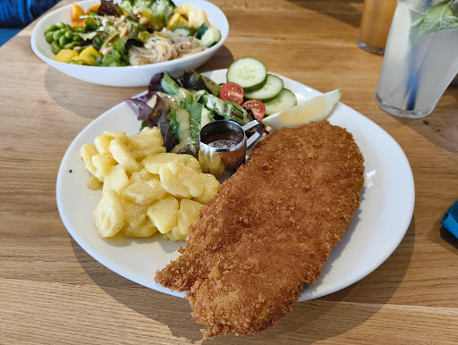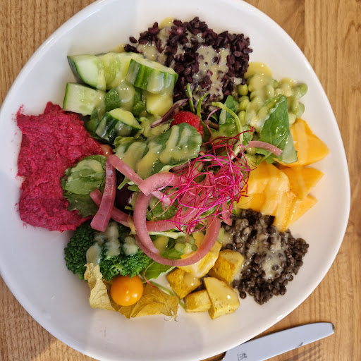 Zunächst eine Bemerkung zur Einrichtung, die durch hochwertige Materialien und klare Linien sehr einladend wirkt. Auch der Hof lädt zum Sitzen ein - das in unmittelbarer Nähe gelegene Kindergeschäft bietet für gelangweilte Kinder eine prima Option, ein bisschen abgelenkt zu werden. Weil es thematisch passt, sei erwähnt, dass ein oder zwei Kinderessen auf der Karte fehlen. Die Karte liest sich ansonsten hervorragend und die Mittagspreise sind absolut angemessen, zumal die Portionen reichhaltig sind. Warum die gehaltvolleren Speisen (Schnitzel, Serviettenknödel etc.) allerdings erst ab 14h00 verfügbar sind, ist nicht nachvollziehbar. Wir hatten unterschiedliche Speisen, die super frisch waren und optisch auf jeden Fall überzeugt haben. Geschmacklich leider teilweise nachbesserungswürdig. So hatten die einzelnen Komponenten der Bowl keinerlei eigene Würze (Kräuter, Zwiebeln, Knoblauch o.ä.). Wenn man den reinen Geschmack des Produktes rausarbeiten wollte, ist das vorzüglich gelungen, mir persönlich war es zu fad und die Sauce dann auch zu sparsam dosiert, um noch ein Erlebnis draus zu machen. Schade, denn auf dem Papier war dieses Gericht der Hammer. An anderer Stelle war das Essen zu scharf, bzw. harte Gegenstände mit dabei, die der Zahnprothese gefährlich wurden.(keine Kerne, auf die wurde ja vorbereitet) Als äußerst gewöhnungsbedürftig haben wir die mangelnde Freundlichkeit des Personals empfunden. Wir wurden von 3 unterschiedlichen Mitarbeiter*innen bedient, von denen es nur eine geschafft hat, uns das Gefühl zu vermitteln, willkommen zu sein. Klar, es war voll, Mittagszeit, wir waren Viele... - nichts desto trotz, das war nicht so super. Fazit: die Idee ist klasse, die Ausführung hat noch recht viel...