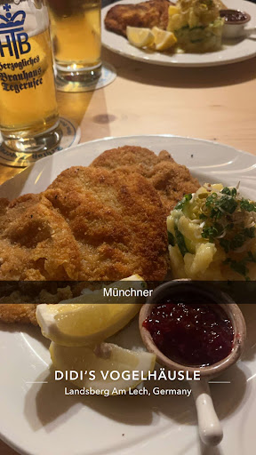 s Vogelhäusl probiert. Soooooooooooo gut! Ganz zartes, dünnes Schnitzel-Fleisch (2 große Stücke!), Top-Panade, sehr gut abgeschmeckt, alles sehr lecker. Der "kleine" Salat rel. groß mit absolut knackfrischen, vielfältigen Zutaten und leckerem Dressing, oben drauf eine Physalis. Didi