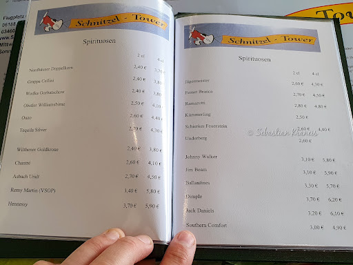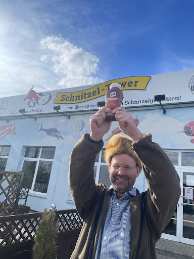 Read moreWir waren auf dem Weg von Magdeburg nach Dresden und wollten mal etwas anderes als Autobahn Höfe ausprobiern. Auf der Suche nach einem Restaurant für eine Rast nahe an der A14, sind wir dann im Internet auf diese Lokalität gestoßen. Es brauchte etwa 5 Minuten Zeit und wir mussten einem Rasthof mit Schnitzel im Angebot widerstehen, um den kleinen Flugplatz und den "Schnitzeltower" zu erreichen. Der Parkplatz war gut gefüllt und auch das Restaurant für einen normalen Freitag Mittag gut besucht. Die erste Frage nach der Begrüßung war dann auch ob wir reserviert hatten. Aber wir hatten Glück wurden nett empfangen und an einen freien Tisch für zwei Personen begleitet. Eine Reservierung scheint von Vorteil zu sein. Die Karte war mächtig gewaltig, wir waren echt überrascht über die zahlreichen Schnitzelvarianten. Ich habe mich für das " Schnitzel mit Camembert Scheiben überbacken" entschieden und es war absolut lecker. Das Ganze war dann unter dem berühmten Strich auch noch recht günstig. Für uns ist das Experiment voll aufgegangen und wir werden definitiv auf unserer nächsten Reise gen Süden hier wieder einkehren. PS auch die Wandgestaltung des WC fand ich originell. Da rückt Mann gleich näher an...