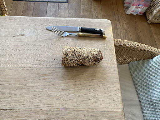 Leider habe ich heute Morgen eine sehr alte, harte und zu kleine halbe Früchtevollkornstange untergejubelt bekommen.