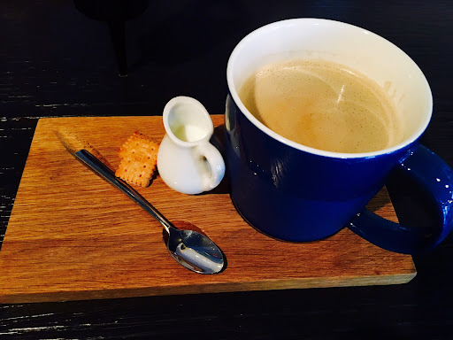 Nach unserer Bestellung brachte der Junge Kellner strammen Schrittes unsere Heißgetränke. Diese standen auf einem Holztablett (Brettchen) mit einer leichten Vertiefung für das jeweilige Gefäß. Der Kellner hatte lediglich nur die Tabletts in der Hand was sich dann Rächen sollte.