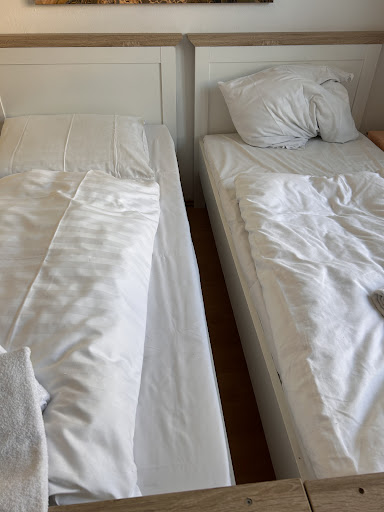 Bei Ankunft: Ein Bett war offensichtlich noch benutzt, Kissen zerknĂŒllt, Spuren vom Koffer auf dem Bett, Zimmer eiskalt bei AuĂentemperaturen um den Gefrierpunkt. Ein Haken, um Jacken aufzuhĂ€ngen, scheint wohl auch nicht dem Standard in diesem Haus zu entsprechen.