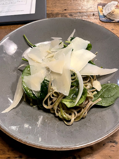 Wir wurden sehr freundlich empfangen und zu einem Tisch in der geräumigen und gemütlich eingerichteten Gaststube gebeten. Kurz nachdem wir unser Essen in Bestellung gegeben hatten, wurde uns eine kleine Vorspeise mit frisch gebackenem, noch leicht warmen Brot gereicht. Die alleine (Bärlauchaioli mit frischem Brot) war schon köstlich und ein leichtes zufriedenes Stöhnen wert... Danach wurde das Hauptgericht gebracht: gebackenes Kotelett vom Landschwein, Kartoffelpürree und gebratenen Pilzen, dazu noch ein schönes, nicht all zu kaltes Frühlings Bock .... (KÖSTLICH! Einfach nur gut....Geschmack, Wärme der Speisen...alles passte auf den Punkt!)