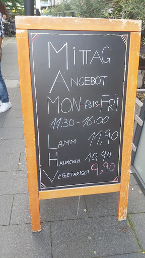 Das Mittagsangebot wird groß mit einer Tafel beworben: für Lamm-, Hähnchen- oder vegetarische Gerichte.
