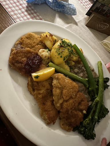 Das Essen war lecker, die Schnitzelportionen sind reichhaltig, insgesamt sogar etwas zu viel. Der Herr der uns bediente war stets gestresst, kurz angebunden, unfreundlich und verwies für Bestellungen an seine Kolleginnen. Anstatt sich zu entschuldigen, dass ein Hauptgericht am Tisch offensichtlich vergessen wurde, zählte er die gelieferten Essen und vertröstete dann unfreundlich das es mit dem fehlenden Essen noch dauere… es kam, als andere am Tisch bereits fast fertig gegessen hatten. Die Dame dagegen, die unsere Bestellung aufnahm und sich regelmäßig erkundigte, ob alles in Ordnung ist, war zuvorkommend und freundlich. Der Innenhof ist sehr schön, leider roch es an unserem Tisch jedoch immer wieder nach Abfluss. Alles in allem einen Besuch wert.