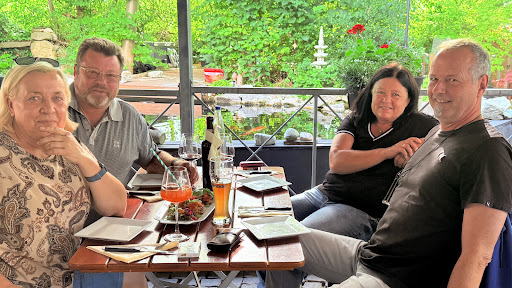 Meine Freundin und ich hatten einen Radausflug entlang vom Regen gemacht und freuten uns im Garten des Restaurants auf unser Abendessen.