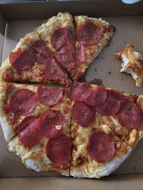 Obwohl ich nur die Hälfte gegessen, den Rand & den Käse versucht habe übrig zu lassen, liegt die Pizza jetzt...