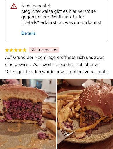 Read moreGenerell wenn ich etwas von Bergisch Burger bestelle fehlt irgendeine Zutat oder es gibt andere Dinge, die stören. Die verzeiht man zugegebenermaßen relativ schnell, wenn man in einen der leckeren Burger beißt. Man verzeiht es auch, wenn es die Ausnahme ist und nicht die Regel. Warum ich nur einen Stern gegeben habe liegt daran, dass ich das letzte Mal echt hangry war und einzig und alleine die gastronomische Leistung und nicht das Essen bewertet habe. Teil 1 davon habe ich oben schon grob beschrieben. Teil 2 ist, dass wir den Kram online zur Abholung bestellen und sogar ein paar Minuten früher ankamen als uns vorgegeben war. Meine Partnerin wurde am Tresen erstmal für geschlagene 7 Minuten ignoriert, nur damit man ihr dann sagt, dass man noch nicht mit der Bestellung angefangen hat und man in 15 Minuten wieder kommen sollte. Das tat sie auch. Und auch da kam sie erst einige viele Minuten später wieder raus. Zuhause haben wir dann wieder ein paar Eigenarten festgestellt. Tomaten im Caesar salad (für mich nicht schlimm, gehören aber nicht rein), keine Gurke aufm Burger. Drei Sachen bei einem Besuch. Wenn man es zeitlich nicht schafft mit der Bestellung kann man vorher anrufen. Das kriegt jede Dönerbude besser hin. Und als wäre das nicht alles, kriegt man es in dem Laden zwar zeitlich alles nicht hin, meine Bewertung wurde aber nach wenigen Minuten mit der Frage kommentiert, was mich gestört hat.