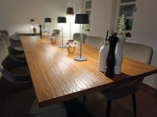 Sehr modernes Ambiente im alten Fachwerkhaus. Sehr angenehm kombiniert. Sehr bequeme Sitzmöbel und chice Tischdeko.