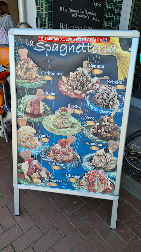 Ein offensichtlich überfordertes Personal hat unsere Bestellung vergessen. 40min und 2 Nachfragen später wurde es zur Chefsache. Dann kam das Eis... Kinderspaghetti Eis für alle, zu unserem Erstaunen aber ohne Sahnekern. Denn den gibt es bei der Kinderversion nämlich nicht. Bei fast 6 Euro pro Kindereis schon eine Frechheit. Geschmeckt hat es dann leider auch nicht. Das Vanilleeis hat nur süß geschmeckt und bei der Erdbeersauce war nichts fruchtiges dran. Auch hier nur roter Zucker. Kleiner Trost, weil wir so lange gewartet haben ging zumindest der warme Kakao fürs Kind aufs Haus. Dafür gebe ich auch gerne den einen Stern. Wiederkommen werden wir aber dennoch nicht mehr und weichen auf die Alternative schräg gegenüber aus (die bis April wegen Renovierung...