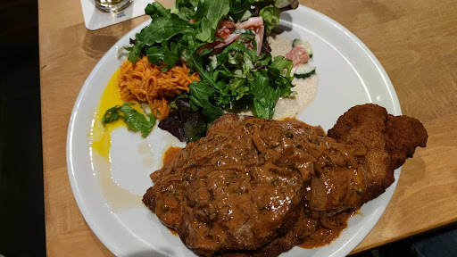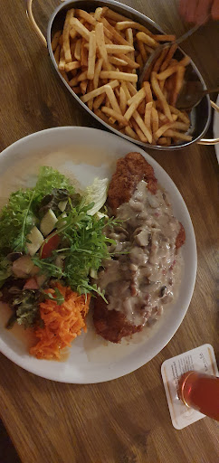 Read moreWir waren mit Freunden da. Ich habe mich auf ein dickes Schweinerückenkotlett gefreut. Dies bekam ich auch, leider war es trocken. Die Zwiebel Senf Soße , passte gut zum Schwein. Meine Frau freute sich auf das einzige vegetarische Gericht auf der Karte , welches aus war. Also kam nur Salat in Frage.