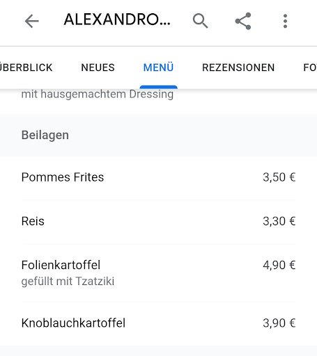 Minuspunkte: Mehrfache Preissteigerungen Preis-Leistungs-Verhältnis stimmt nicht mehr Einfache Gerichte, wie ein Hackfleischgericht, für überzogene Preise (z. B. 17,50 €) Online-Speisekarte schwer zu finden und veraltet, zeigt oft noch die alten Preise Ambiente erinnert mehr an eine Kegelbahn als an ein typisch griechisches Restaurant Auch das Mitnehmen von Speisen ist durch die Preissteigerungen nicht mehr erschwinglich