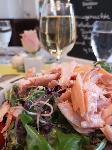 Read moreAlle Vorspeisen Suppen (Spargel- Bärlauch- und Markklößchen-Suppe) schmeckten lecker. Die Bäckchen in Rotweinsoße waren ganz lecker, das Cordon bleu war sehr trocken auch die Panierung - die Bratkartoffeln dafür zu wenig kross, das medium bestellte Rumpsteak war sehr englisch, schmeckte aber trotzdem, der Beilagen Salat war extrem lecker und der Wurstsalat war ok. Allerdings war der Service sehr unaufmerksam und wirkte etwas kurz angebunden und gestresst. Die Atmosphäre war laut, unruhig und ungemütlich. Als es begann zu regnen kamen 3 Paare mit nassen Hunden von draußen und standen lange direkt an unserem Tisch im Gang, die Hunde schüttelten sich und rochen nach nassem Fuchs. Die Pralinenbar macht vor den Speisetischen auch keine gute Stimmung, es fühlt sich alles hektisch unruhig und stressig an und man hat irgendwie dauerhaft den Eindruck gestört zu sein. Die Stühle im Innen Bereich sind unterirdisch unbequem, anlehnen konnte man sich nur, wenn es einen nicht störte da zu liegen als wolle man gebären - wirklich sowas von unbequem! Schade, wir werden nicht mehr kommen, vielleicht im Sommer nochmal draußen?! Der Salat war...